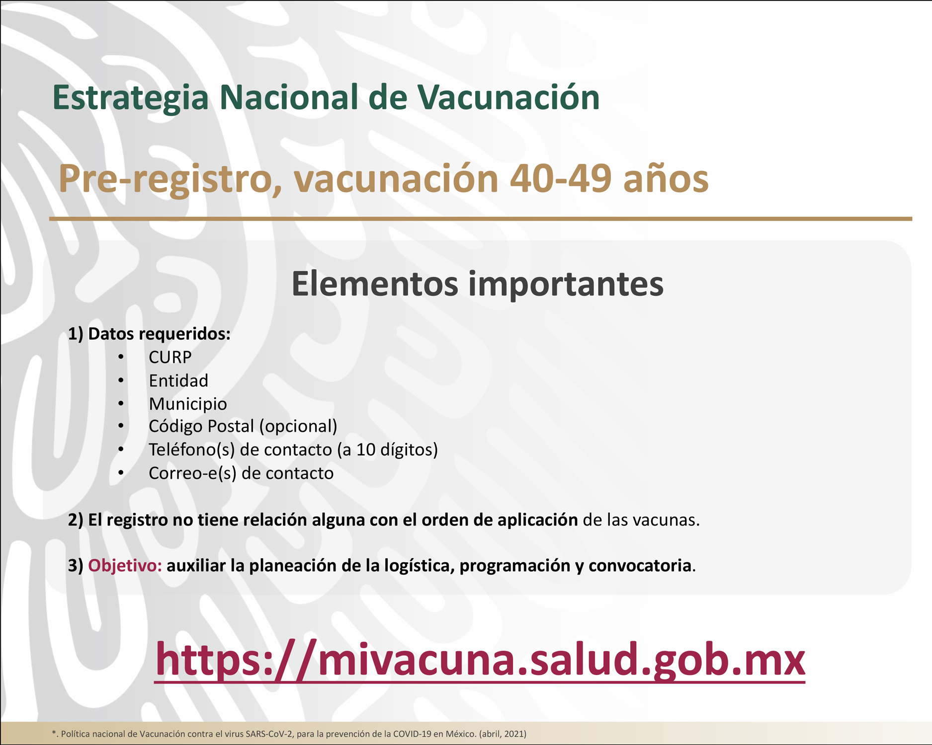 Se debe entrar a la página oficial de mi vacuna. Por el momento este sitio está habilitado únicamente para accesar desde el salvador. Los resultados del estudio de la eficacia de la vacuna sputnik v han sido sometidos a una evaluación internacional comparativa; El servicio de salud de cada comunidad autónoma contactará con las personas a las que va a vacunar, siguiendo el orden de priorización establecido. Como bien se dijo al principio de la nota, el gobierno y las autoridades en méxico dispusieron que esta nueva fase de vacunación esté destinada a los adultos que anteceden a los mayores en todo el territorio. Registro de vacuna covid de 40 a 49 ya está activo | el universal. El presidente de méxico, andrés manuel lópez obrador, comentó en una de sus conferencias matutinas que la vacunación para personas en este rango de edad iniciaría en el mes de junio de este año. ¿cómo registrarse para la vacuna anticovid? Personas entre 40 y 49. Las personas de 40 a 49 años interesadas en vacunarse contra el coronavirus deben registrarse en la página de mi vacuna y proporcionar datos personales. Ahora están disponibles las citas para el mismo día y sin coordinación previa. Se recomienda que acudan a la vacuna desayunados e hidratados. Después se debe dar clic en el botón 'quiero vacunarme'.